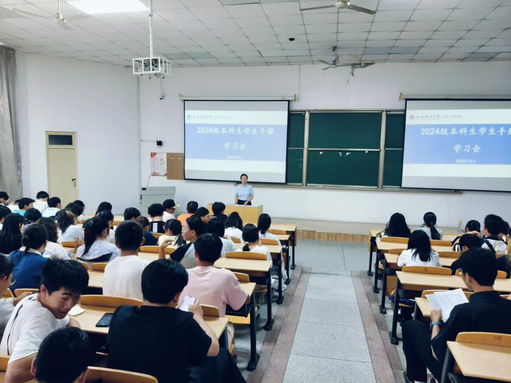 9月14日,为帮助大学生更好地了解学校规章制度,明确自身权利与义务,学院在9号教学楼105组织集中学习学生手册,学院2024级全体本科生参加,学工办主任李琳主持。