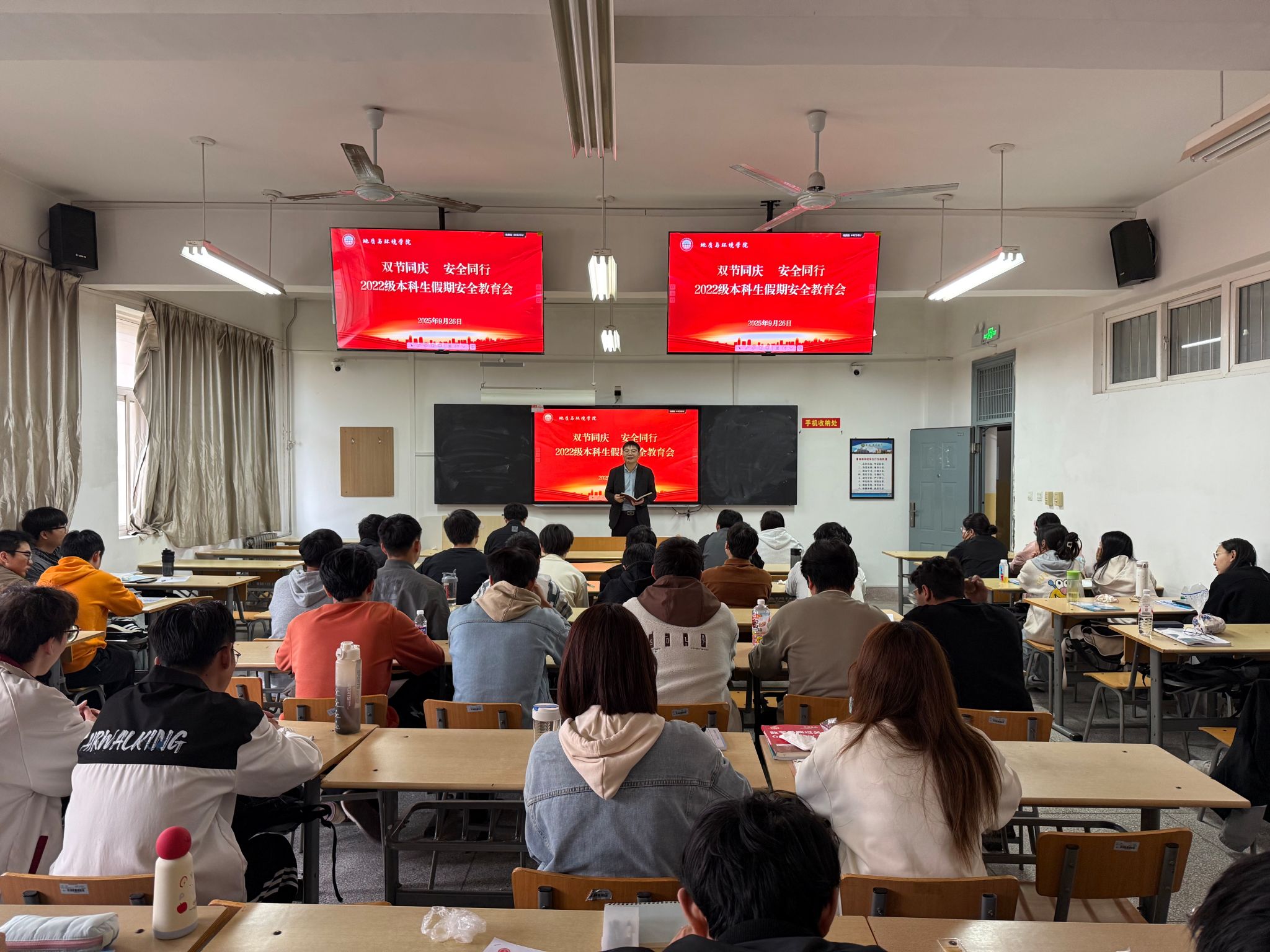 会上,余小涛通报了2025年国庆节、中秋节放假安排,他结合相关案例从人身安全、财产安全、交通安全、饮食安全、网络安全、宿舍安全等方面对全体本科生进行了一趟生动详实的安全教育课。他强调,全体同学要提高安全防范意识,严守安全稳定底线;要严格落实假期去向登记制度,做到底数清、情况明;要规范宿舍用电安全,杜绝使用违规电器,共同维护整洁安全的宿舍生活环境。