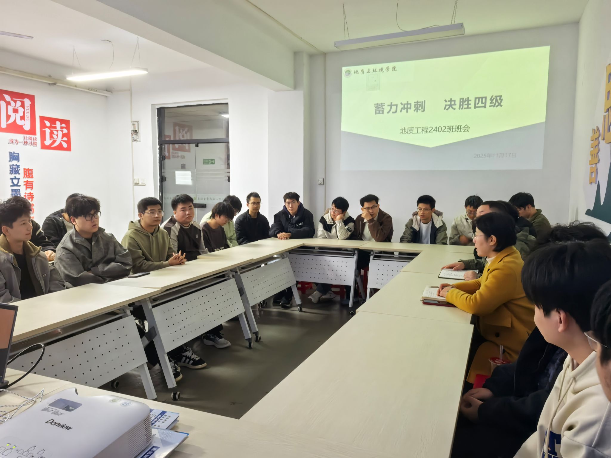 为帮助同学们把握英语四级备考关键期,11月17日,学院地质工程2402班在“一站式”学生社区召开“蓄力冲刺,决胜四级”主题班会。班会由辅导员李琳主持,班主任和全体同学参会。