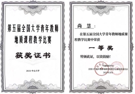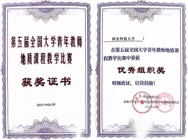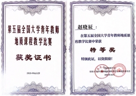 大赛分地质综合组、普地组、岩矿组、地质核心课程组、油气与勘探组、地工综合组、水文与工程地质组等7个小组,从教学设计、教学内容、教学组织、语言教态等方面进行评分。经过激烈角逐,我院三位参赛教师凭借卓越的教学风采与创新的课程设计在比赛中斩获佳绩,载誉而归,青年教师赵晓辰勇夺大赛最高奖项—特等奖,尚慧、姜鹏飞两位老师双双斩获一等奖。这是我院教师历届参加比赛以来的首次获取特等奖,实现了教学竞赛新突破。同时,鉴于学校在初赛方面的出色组织与选手们的优异表现,我校被授予“优秀组织奖”,实现了参赛成绩与组织荣誉的双丰收。